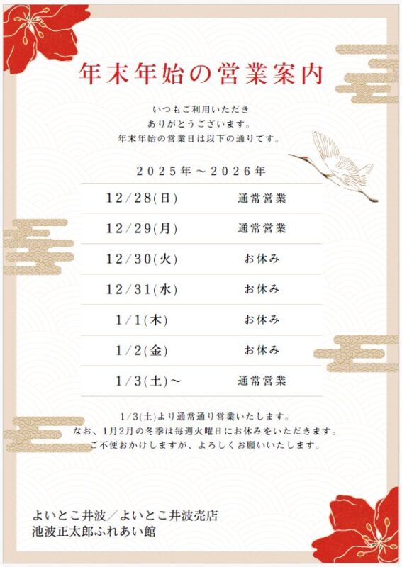 平素より当館をご利用いただき、ありがとうございます。 年末年始は下記の期間、休館とさせていただきます。 また、冬季(1〜2月)は通常…