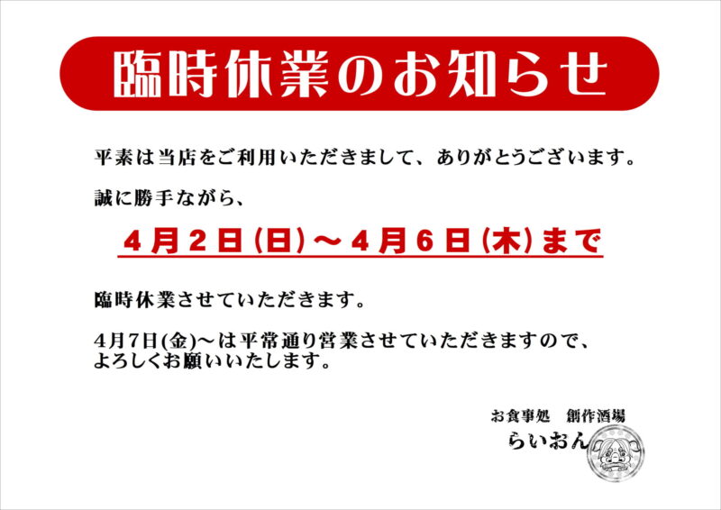 当館テナントの【お食事処・創作酒場らいおん】ですが、4月2日(日)~4月6日(木)まで臨時休業いたします。 ご来店予定のお客さまには大変ご迷惑を…