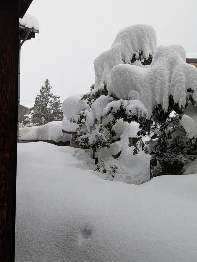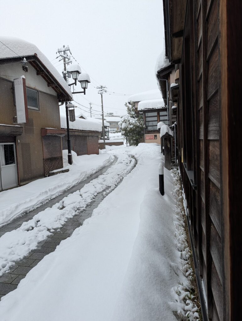 大雪警報中、当館には八日町通りからの正面入り口と、横手後方の公衆トイレ側の入り口のみ除雪できています。中庭はもう通行できなくなりました。落雪の危険もございますので、通行禁止にさせていただきます。